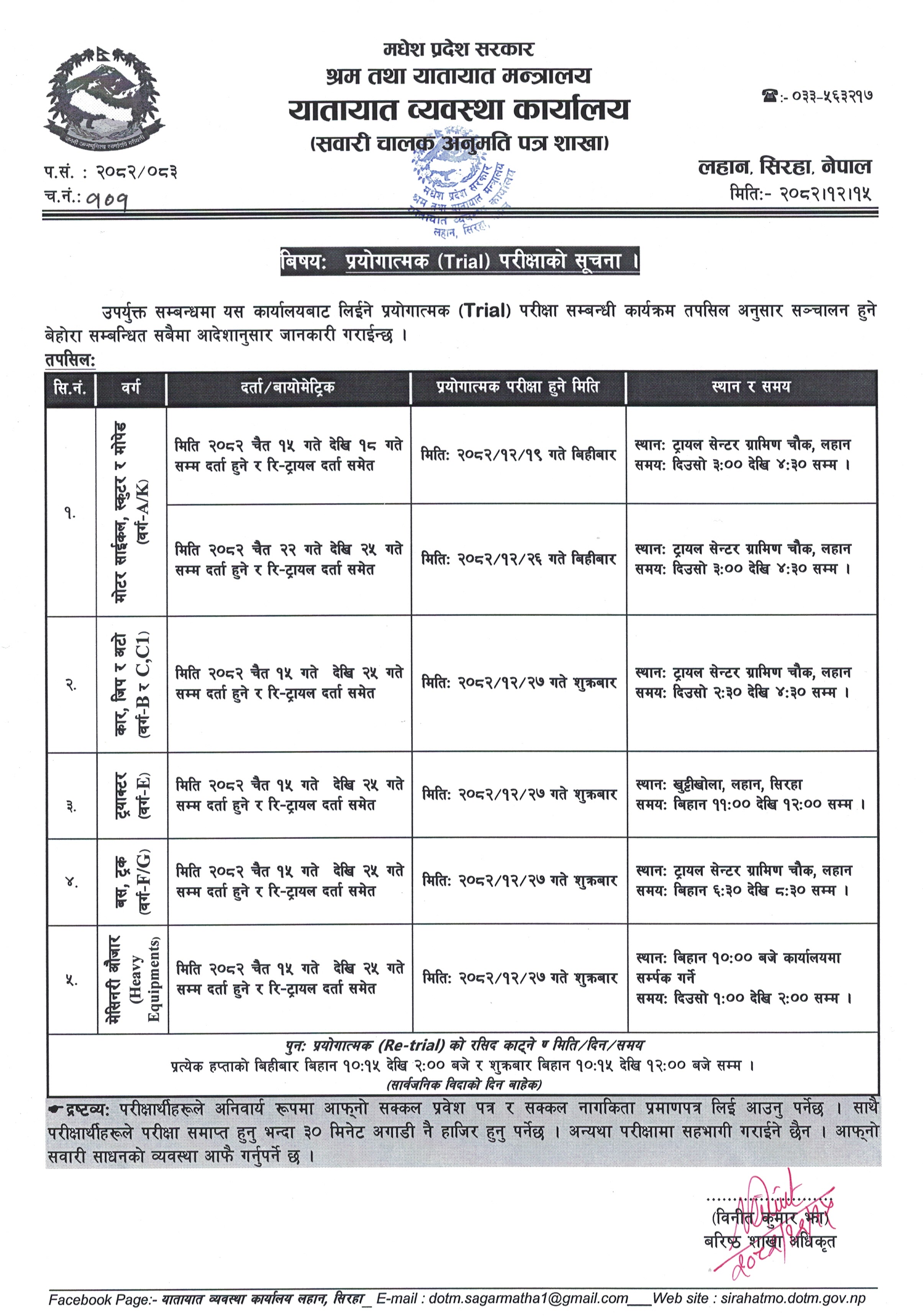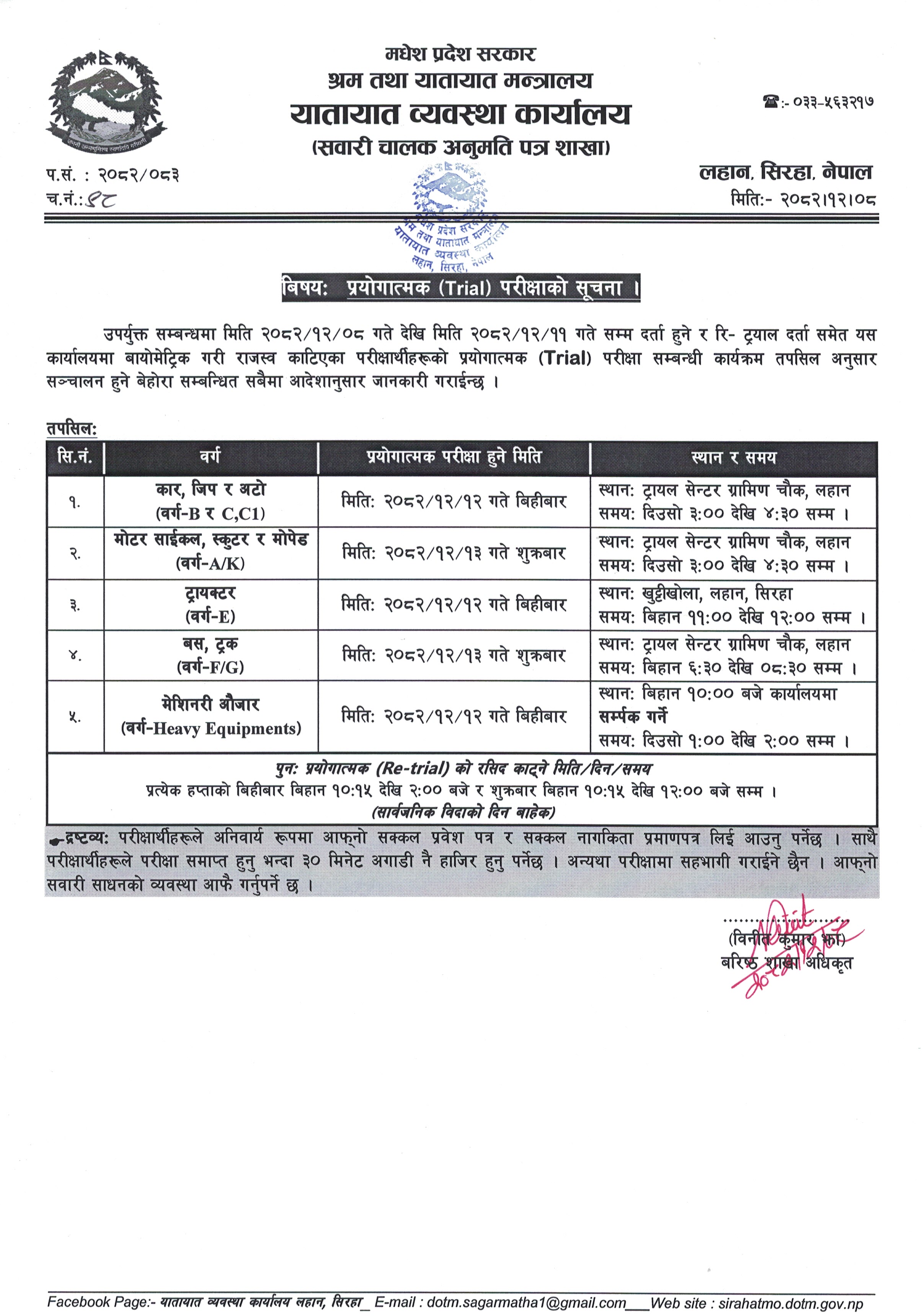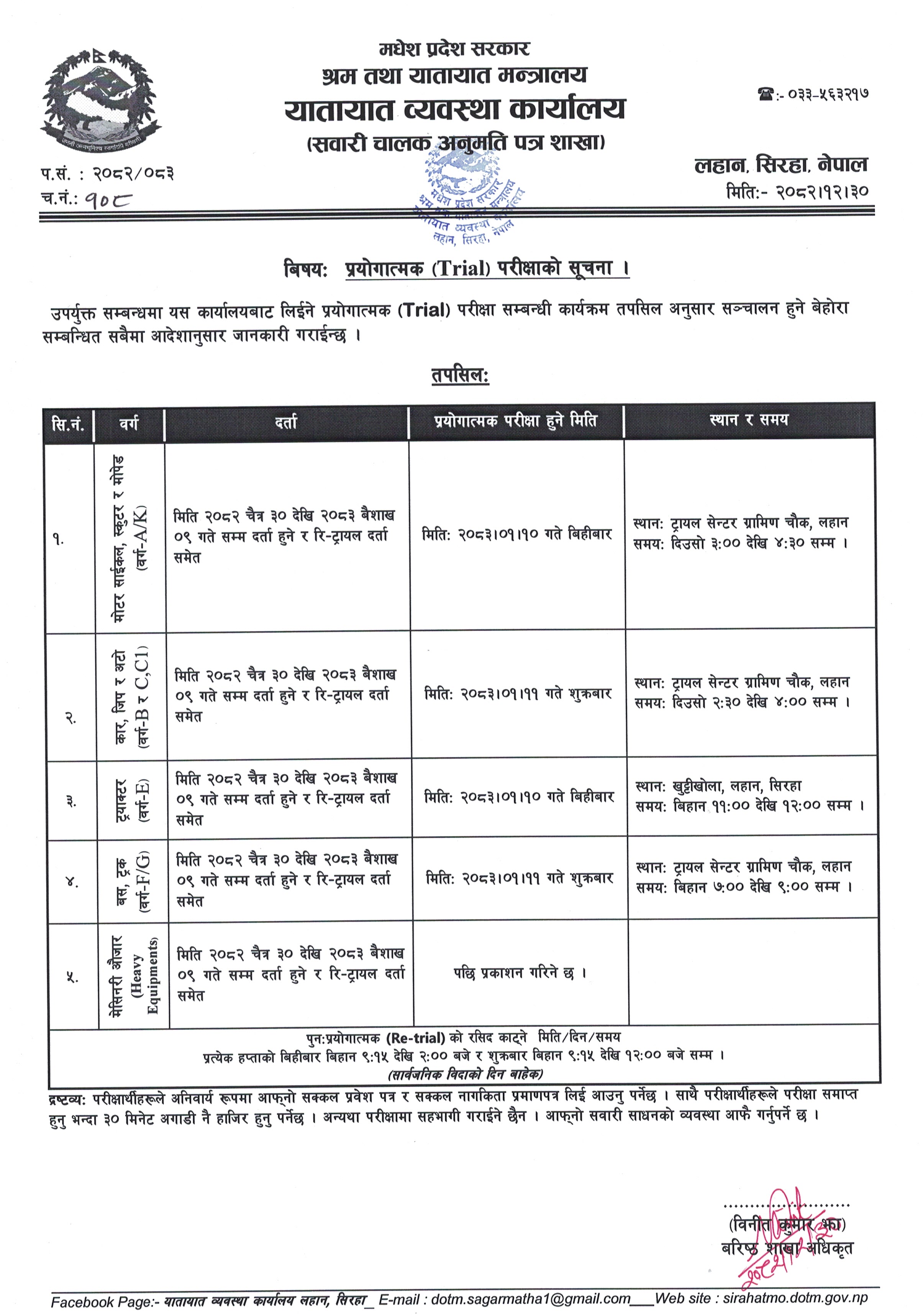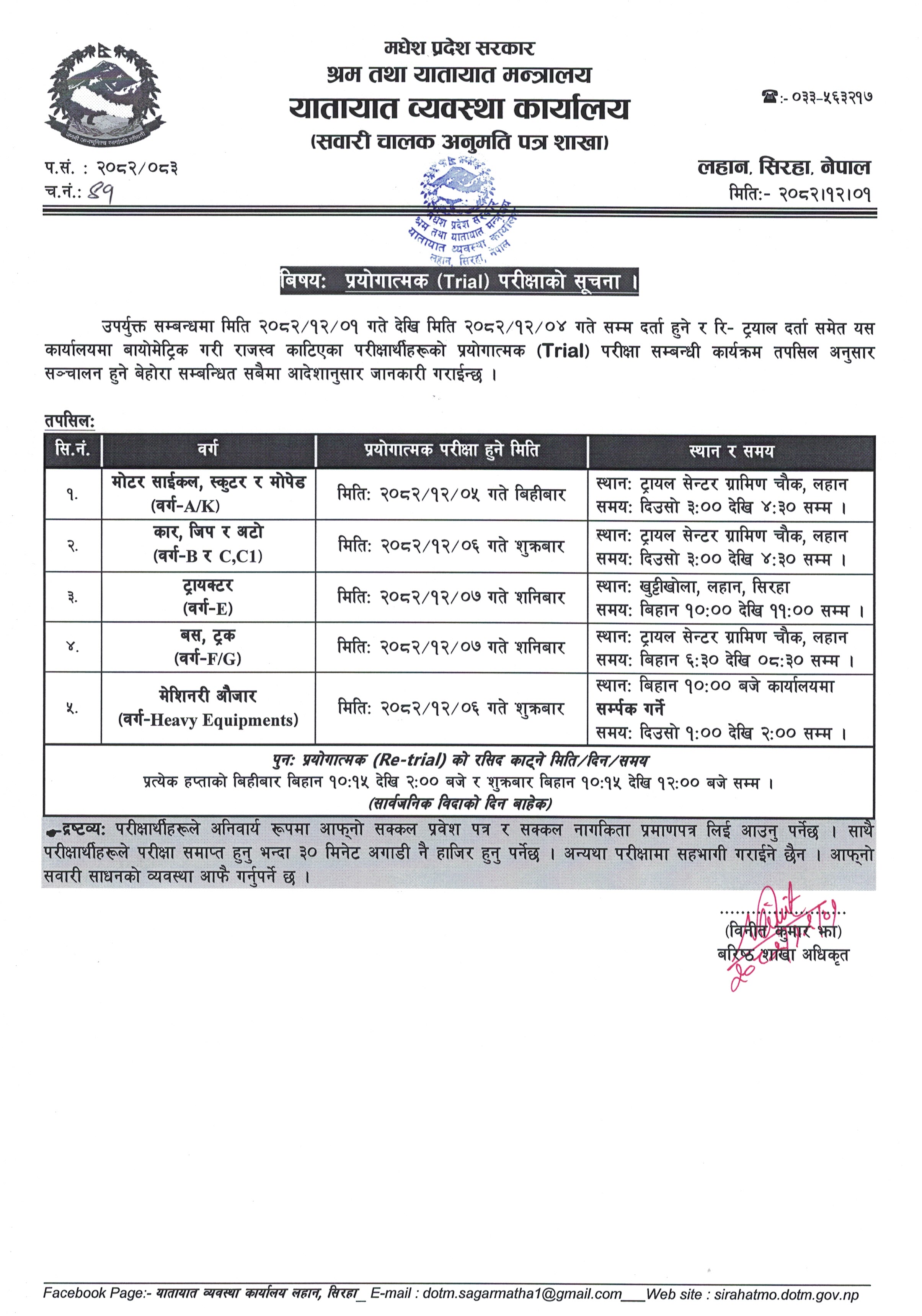 यातायात व्यवस्थापनको कार्य गर्नका लागि वि.सं. २०४१ मा यातायात व्यवस्था विभागको स्थापना भएको हो । यातायात व्यवस्था कार्यालय, लहान, सिरहा देश संघीय संरचना जानुभन्दा पहिला यातायात व्यवस्था सगरमाथा अञ्चल कार्यालय रहि करिब ६ वटा जिल्लाकै कार्यक्षेत्रमा सेवा प्रवाह गर्दै आएको थियो । वर्तमान संविधानको संवैधानिक व्यवस्था बमोजिम यातायात क्षेत्रको व्यवस्थापकीय भूमिका प्रदेश मातहत स्थानान्तरण भए मुताविक हाल देश भित्रका यातायात व्यवस्था कार्यालयहरु प्रदेश सरकार मातहत रहि प्रदेश सरकारको खटनपटन बमोजिम सवारी चालक अनुमति पत्र वितरण, कर दस्तुर संकलन लगायत यातायात क्षेत्र सम्बद्व अधिकांश व्यवस्थापकीय कार्यहरु भइरहेका छन् । हाल मधेश प्रदेश सरकार, श्रम त थप पढ्नुहोस्